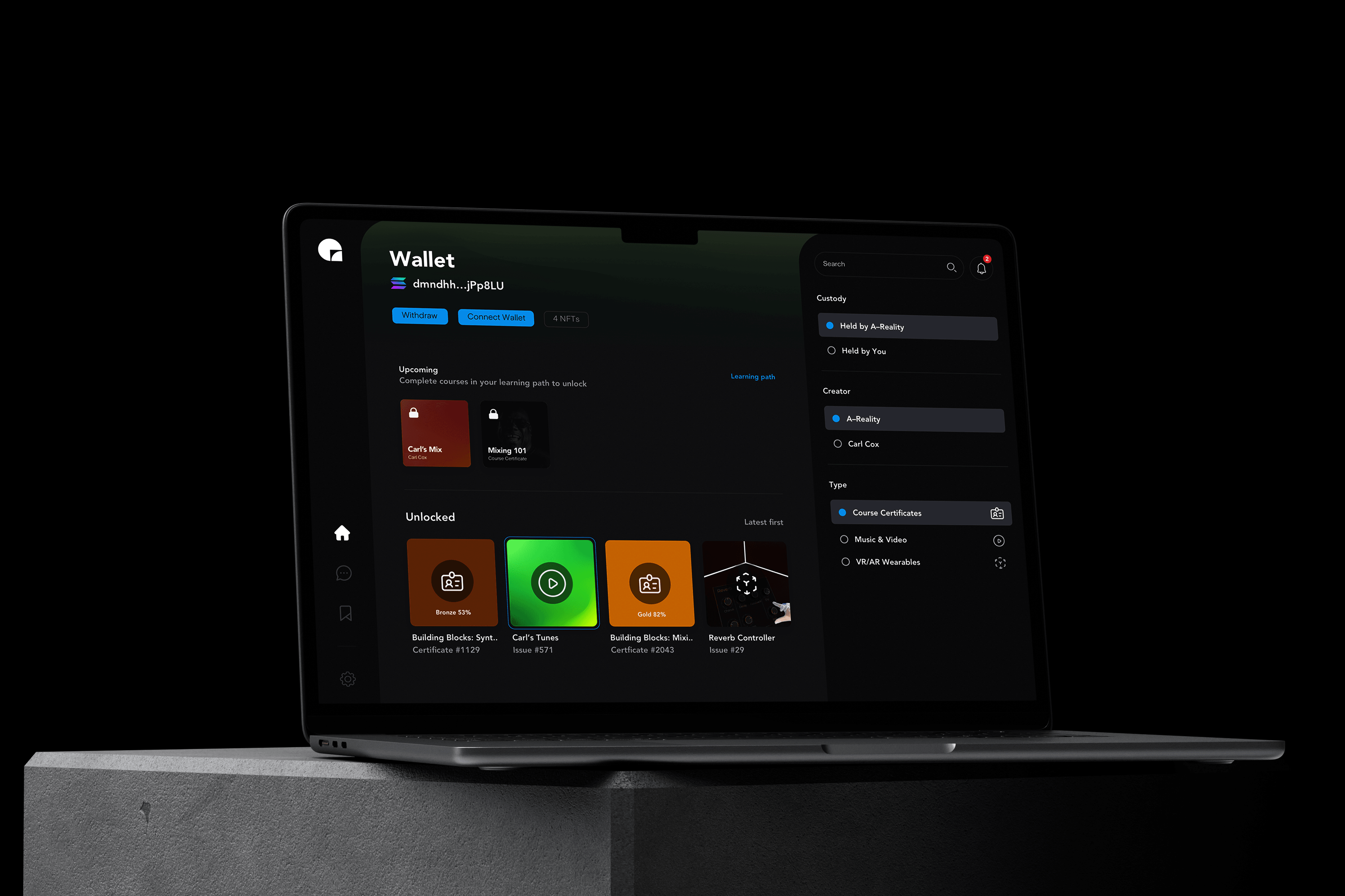 A-Reality, recognized for its virtual reality education platform catering to upcoming music producers, envisioned a new approach to the learning experience. They sought to harness the benefits of NFTs in gamification & course certification – independent verification, permanence, and the capacity to unveil novel experiences in a secure, decentralized framework.